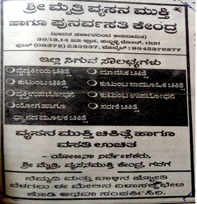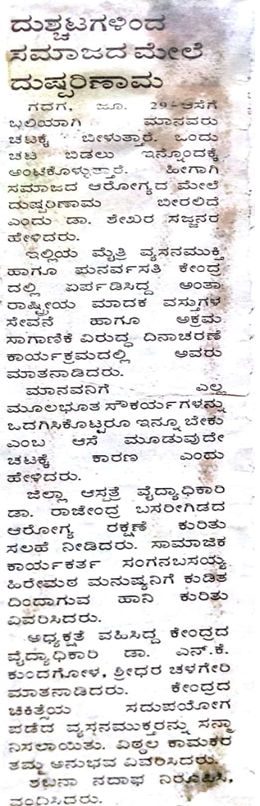 Published about distribution of awareness Pamphlets of ill-effects of Drugs and treatment in Gadag Dist Sahitya Smmelana at Prajavani Daily newspaper on 09-03-2008