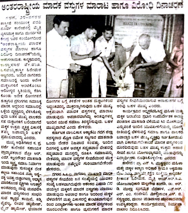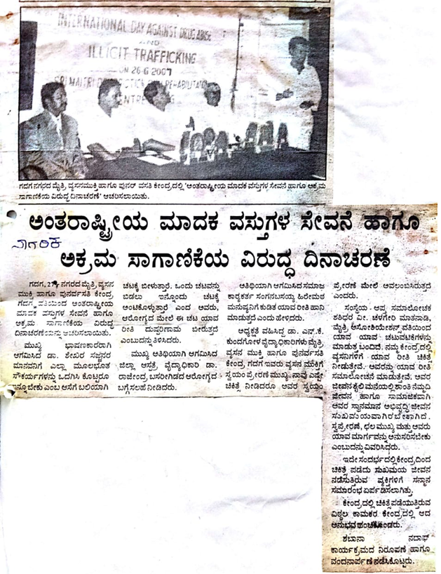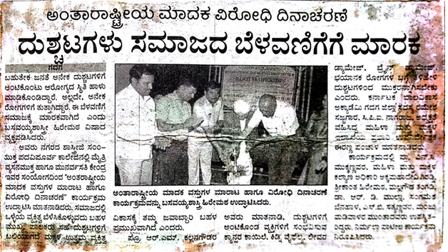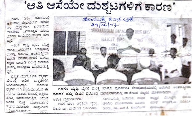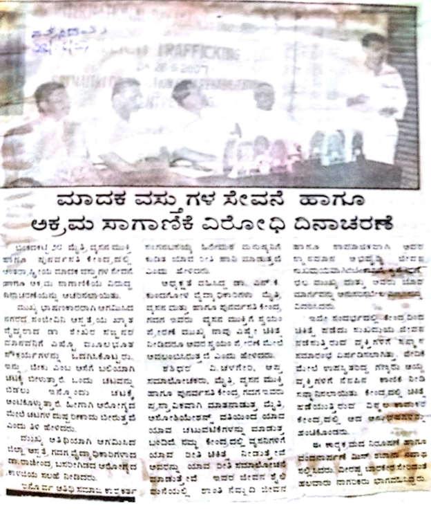 Published about celebration of International Day against Drug Abuse at Prajavani,Vijaya Karnataka, Sanyukta Karnataka, Nagarik Daily Newspaper on 26-06-2007