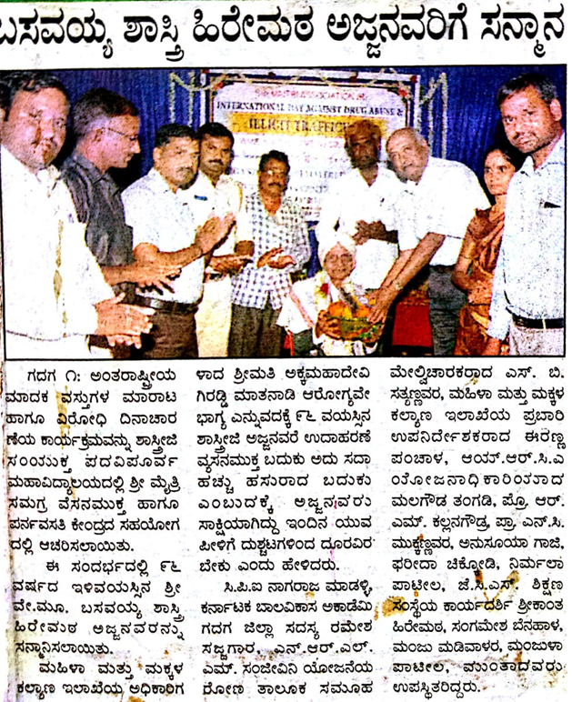Published about celebration of International Day against Drug Abuse at Prajavani Daily Newspaper on 28-06-2010